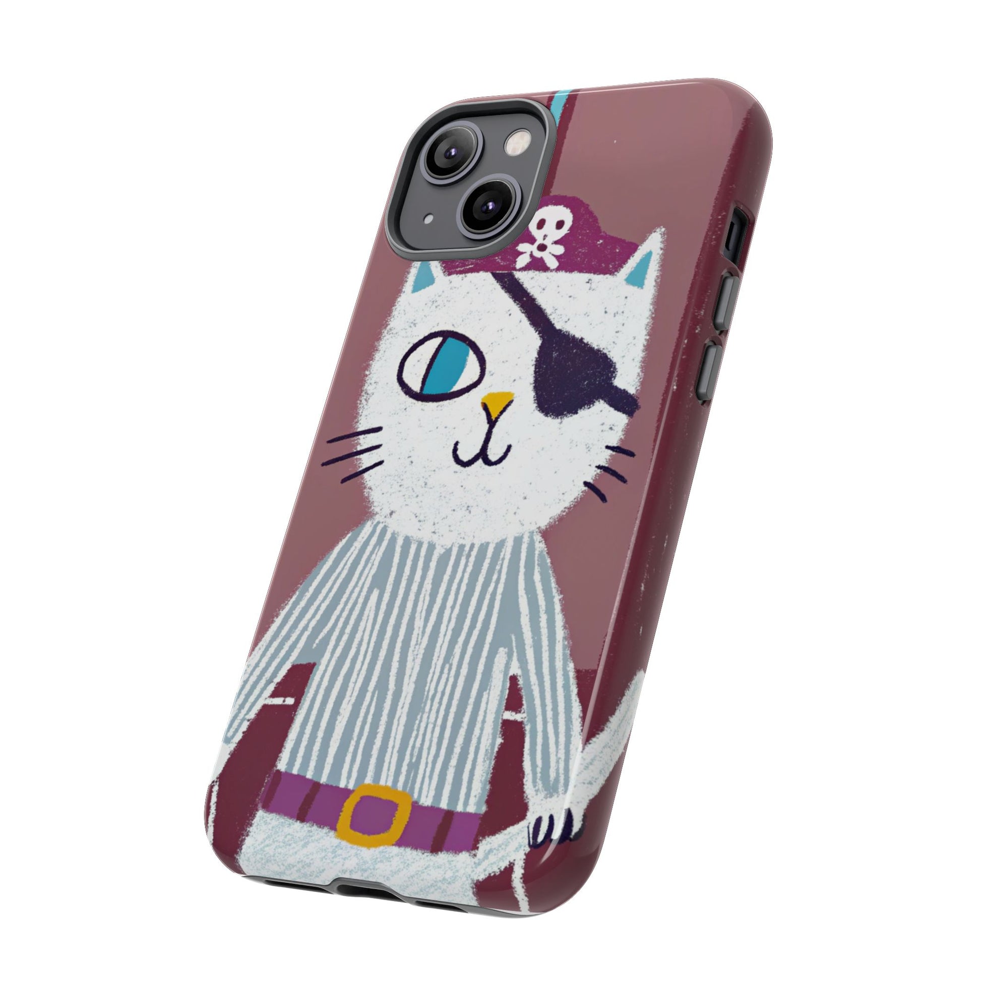 A durable and impact-resistant phone case featuring a hand-drawn design of a pirate cat, perfect for cat lovers. The case provides excellent shock absorption and protection against drops and tears. Ideal for adults looking to add a touch of humor to their phone accessories. Great for gifting on birthdays, Christmas, or any occasion.